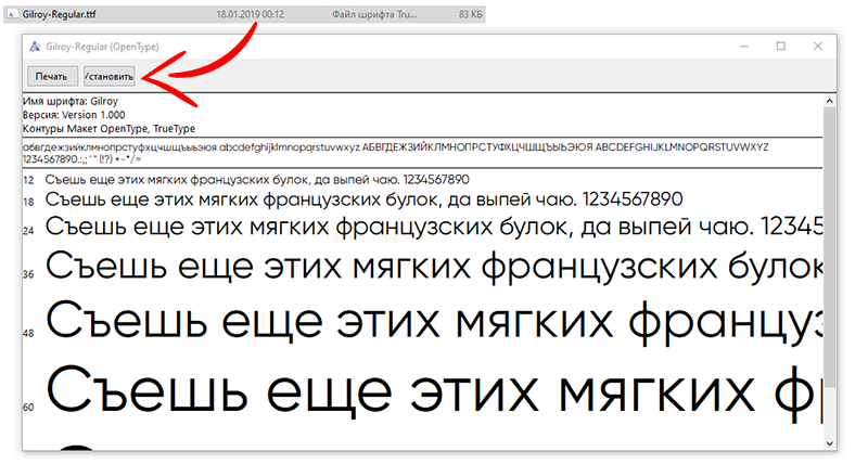 Для установки, просто кликните по нему два раза левой кнопкой мыши. На экране появится предпросмотр где можно увидеть все символы и краткую информацию. Чтобы добавить шрифт, нажмите кнопку “Установить”.