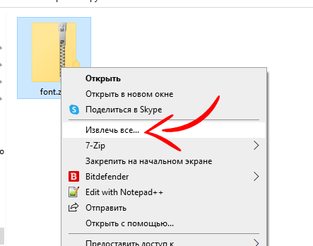 Если вы скачали шрифт и он запакован в архив .zip, .7z или .rar, нужно предварительно его распаковать. Для этого нажмите по нему правой кнопкой мыши и выберите в контекстном меню “Извлечь все”.