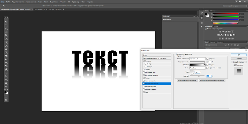 - Теперь из нее создадим отражение. Для этого кликаем 2 раза в правой стороне слоя. Откроется диалоговое окно, где выбираем «Наложение градиента». Подбираем нужные форматы. Получаем как раз то, что необходимо нам!